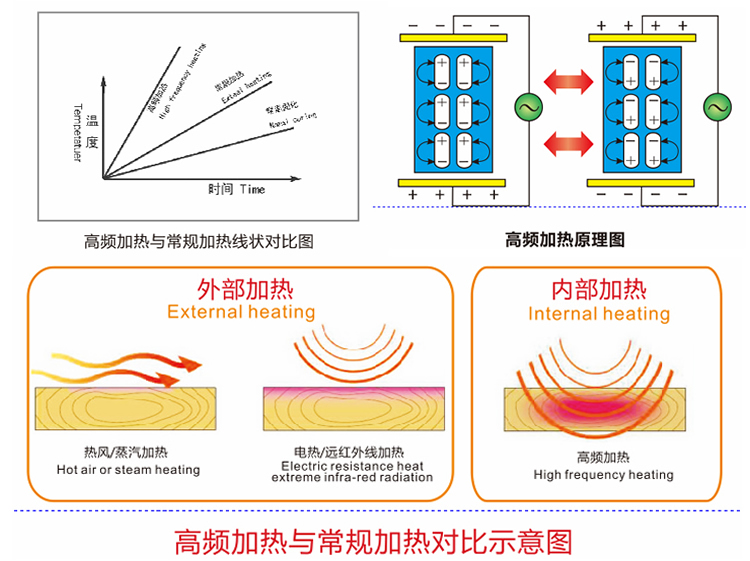 高頻干燥采用高頻電磁場作為加熱源,高頻設(shè)備將普通電源轉(zhuǎn)化成高頻電場,電磁場能夠穿透木材,木材中的水分子會吸收高頻電場,自身極化,分子間極速摩擦產(chǎn)生熱量,因而高頻加熱方式是水分自身產(chǎn)生的熱量,因而水分多的部分吸收高頻能量自然多,也就成就了高頻設(shè)備與生俱來的優(yōu)勢。