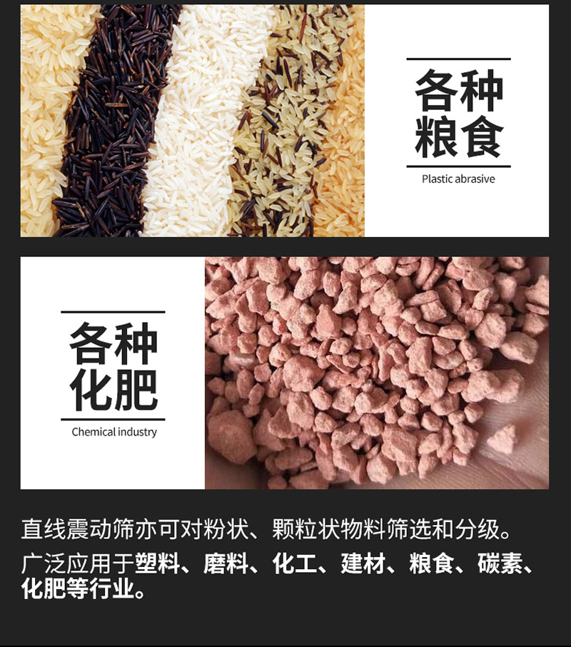1、【振動篩分機:】常用于小麥、水稻、玉米、大豆、棉種及各種油料種子的精選、分級和除雜。適合廣大種糧收糧大戶和飼料加工廠使用。,振動篩選機篩選大豆和玉米每小時3噸,篩選小麥和水稻每小時2噸,篩選棉種和油料種子每小時500-1000公斤。對糧食和油料里面的灰塵、碎屑、壞糧及小石子等雜質(zhì),篩分率達到95%以上!。
