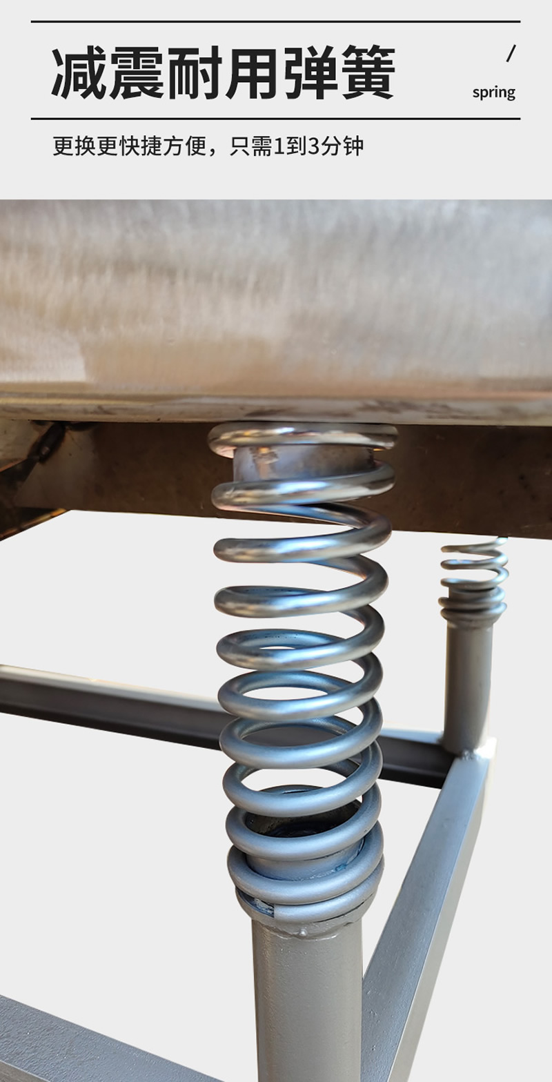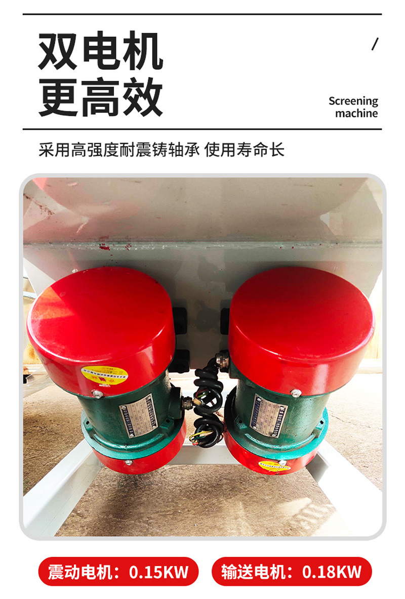 2、振動篩選機可選用220V-2.2kw或380V-1.5kw電機做動力源,集風選和篩分為一體,能干凈徹底地清除糧食或油料種子里面的各種雜質(zhì)和塵土,振動分選機由料斗、機架、傳動機構(gòu)、風機、風道等五部分組成,機架地腳裝有四個輪子,方便移動;篩網(wǎng)與機架采用分體式結(jié)構(gòu),便于更換各種不同目數(shù)的網(wǎng)篩。