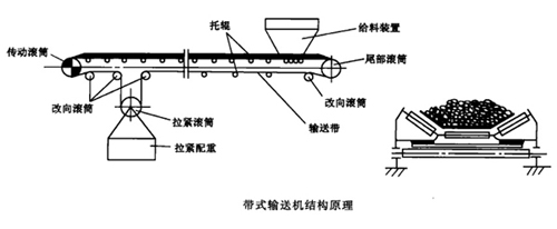 膠帶輸送機(jī)主要由機(jī)架、輸送皮帶、皮帶輥筒、張緊裝置、傳動(dòng)裝置等組成。機(jī)身采用優(yōu)質(zhì)鋼板連接而成 ,由前后支腿的高低差形成機(jī)架,平面呈一定角度傾斜。機(jī)架上裝有皮帶輥筒、托輥等,用于帶動(dòng)和支承輸送皮帶。有減速電機(jī)驅(qū)動(dòng)和電動(dòng)滾筒驅(qū)動(dòng)兩種方式。